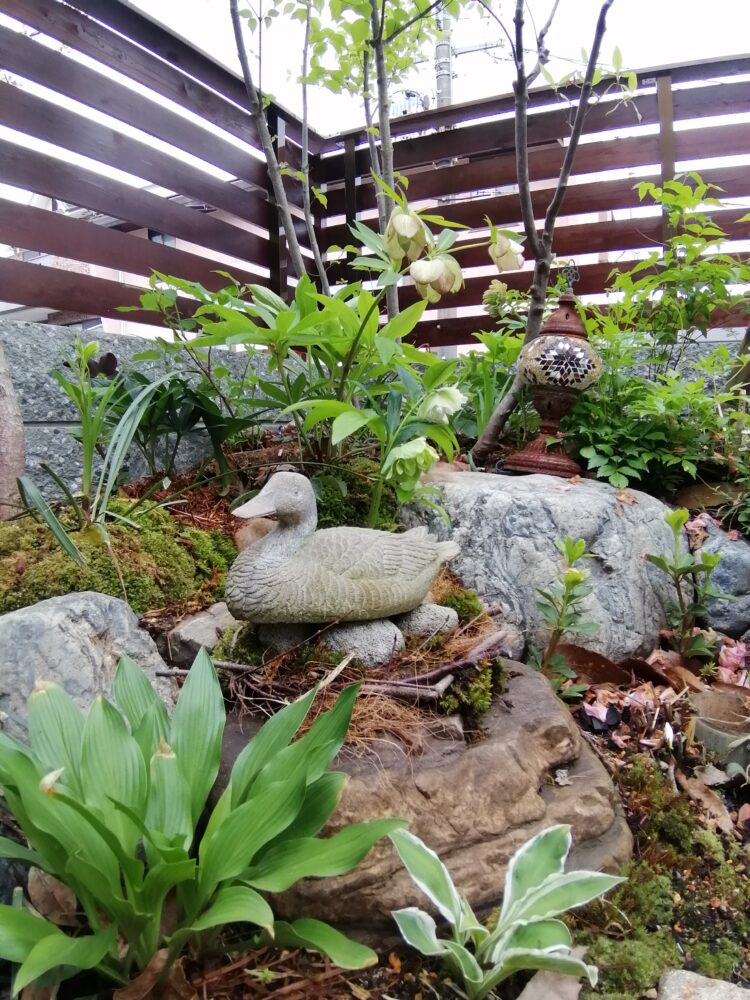 小高い丘の上の住宅地の一角にあるお宅。野鳥が好きなお客さまは、食べるものの少ない冬の間、お庭にヒマワリの種や雑穀、ミカンなどを置いてあげています。それもあって、いつも小鳥たちのさえずりが響く賑やかなガーデンに。I様がお持ちだった様々なガーデンオーナメントやアイテムを配置すると、「借りぐらしのアリエッティ」の世界観のようなお庭になりました。古民家の梁や柱を使ったお洒落なたたずまいの家屋がまた素敵で、お庭の格をひとつもふたつも上げてくれているように思います。